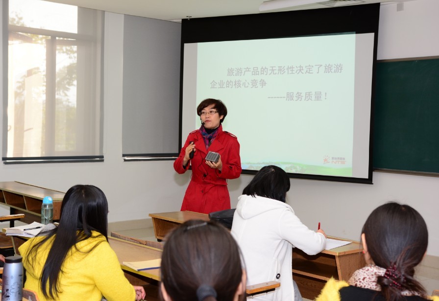 如果说导游是旅游企业发展的基石,那么服务就是旅游企业发展的核心。2013年11月25日下午1时30分,在恕园11号楼207室,浙江新世界国旅副总王莉来我院做了题为“旅游企业服务核心”的讲座。长达两个多小时的讲座给前来聆听的同学们带来了一场面对面的交流,也让同学们感受到了心灵的震撼。