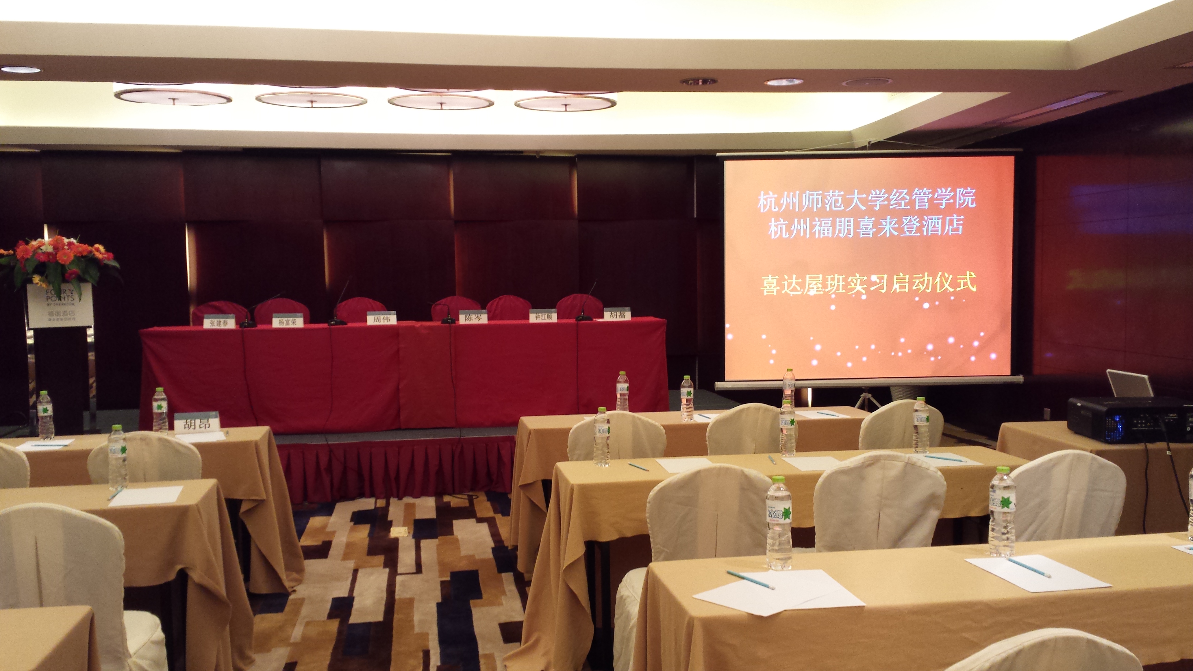 10月23日,经管学院与喜达屋酒店管理集团旗下的杭州龙禧福朋喜来登酒店、上海虹桥喜来登酒店合作的旅游管理专业校企合作第一期管理培训生实习启动仪式在杭州龙禧福朋喜来登酒店举行。校学生处副处长陈岑、学院副院长杨富荣、学院党委副书记钟江顺、旅游系主任张建春教授、辅导员陈冰和杭州龙禧福朋喜来登酒店副总经理周伟、人力资源总监胡蔷、人事部经理胡昂等参加了启动仪式。