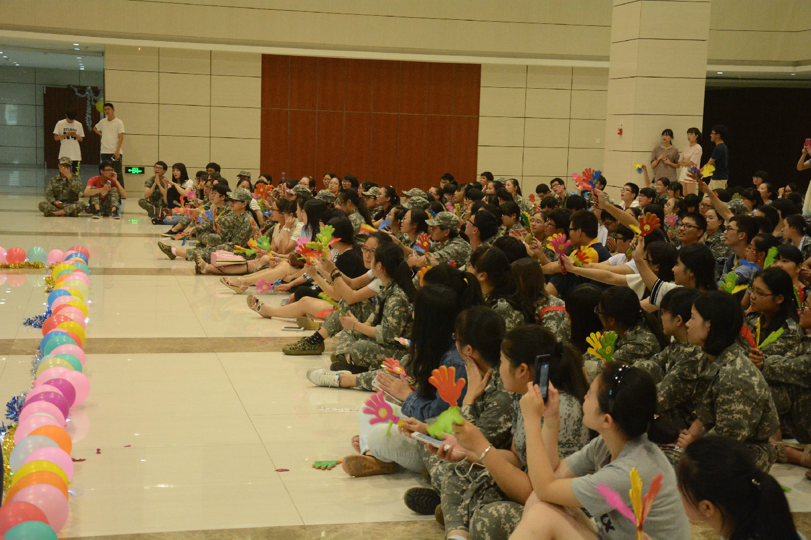 9月18日晚上六点半,经济与管理学院2015级新生军训晚会在恕园1号楼大厅成功举行。我院辅导员苏晓松老师、陈冰老师、一营一连所有教官和2015级新生一同参加了本次晚会。