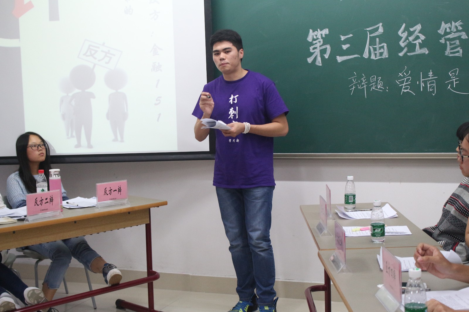 第一场经济151和经济152围绕“在校大学生积累知识重要还是塑造人格重要”拉开了复赛的序幕。经济151班的辩手们侃侃而谈,一一举例例证在大学塑造人格的重要性,经济152班的辩手们也不甘示弱,从现实生活出发坚守立场,镇定自若地反驳对方的观点。第二场经济151和金融151就“离婚率上升是否是社会文明的体现”,第三场经济152和金融151就“爱情是自私的还是无私的”展开了激烈辩论。三场比赛每一方的辩手们都表现地十分出彩,无论是引经据典还是从事实出发,每一位辩手的发言都有理有据。