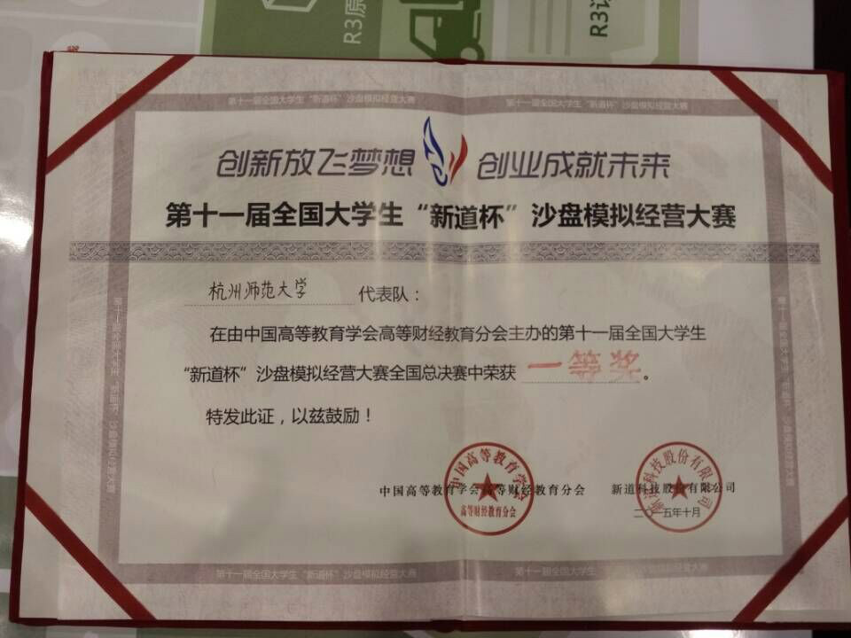 “创新放飞梦想,创业成就未来”第十一届全国大学生“新道杯”沙盘模拟经营大赛全国总决赛于2015年10月23至25日在西安培华学院隆重举办,历经3天的激烈角逐,由我院经济学专业王晓维、叶赛、凃成亨3位学生和阿里巴巴商学院2位学生共同组成的参赛队以第一名的成绩获得了一等奖的佳绩。团队指导老师为我院彭伟斌老师和阿里巴巴商学院李菁苗老师。
