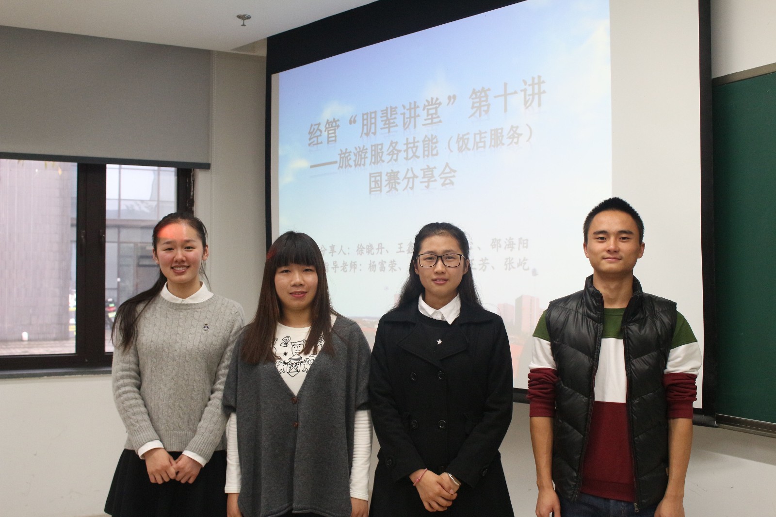 11月4日下午1点30分,经济与管理学院“朋辈讲座”第十讲——旅游服务技能国赛分享会在恕园12号楼107室正式开讲。我院副院长杨富荣副教授和旅管131潘可心、旅管131王鑫晶、旅管141邵海阳、旅管143徐晓丹进行了相关比赛经验和心路历程的分享。