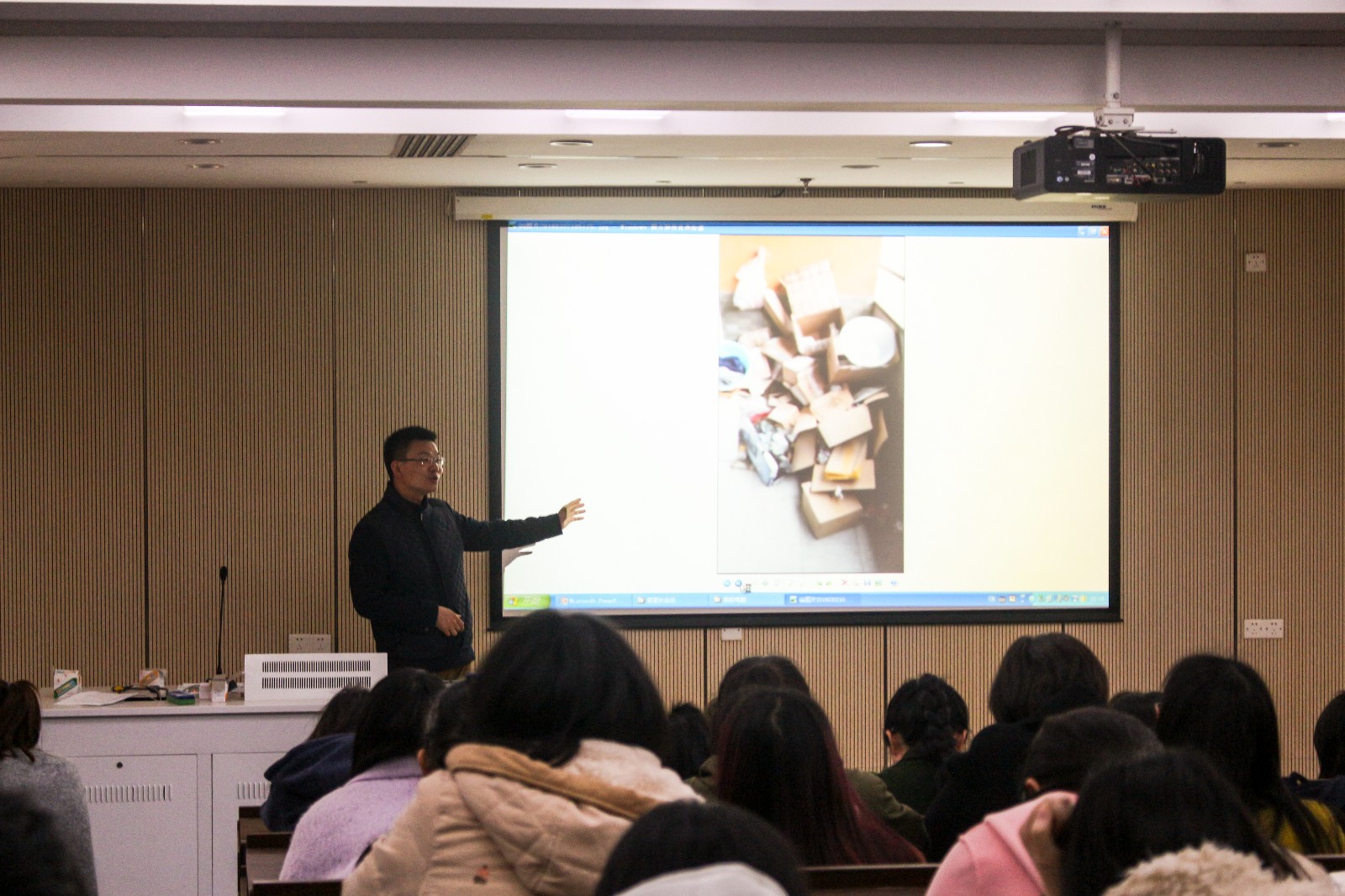 随后,钟书记向大家展示了上周学院领导走访寝室时的一些实况照片,有堆满东西杂乱的阳台,有满是瓶瓶罐罐的桌子,有接满了插头的插座;当然也有摆放整齐的鞋柜,整理得当的书橱,叠得方方正正的被子……钟书记严厉批评了照片中脏乱差的寝室现象,号召在座的寝室长带动寝室成员一起,向优秀的文明寝室看齐,打扫干净寝室。