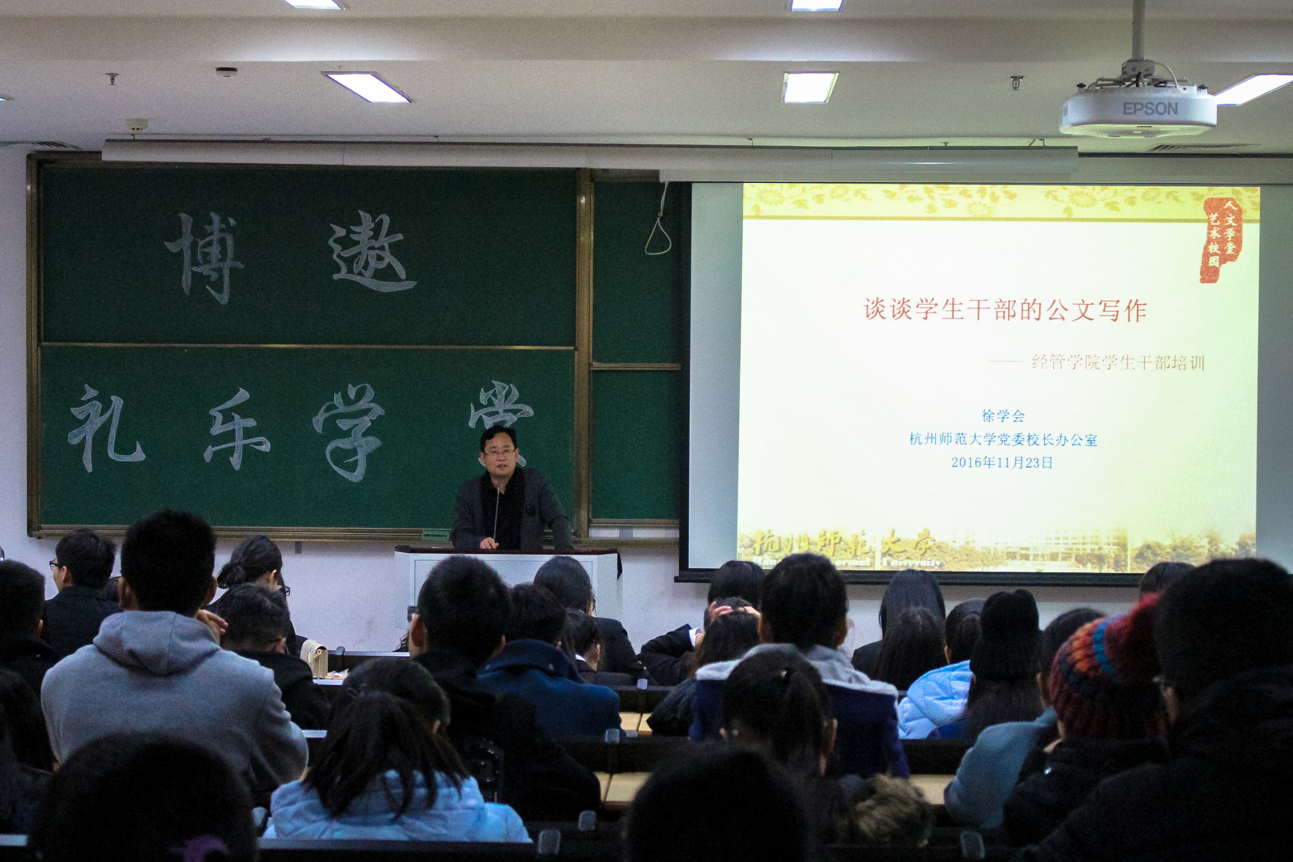在校园与社会工作中,格式规范,内容完整的公文往往具有较高的权威性,并能获得较高的执行力。11月23日下午2点整,我院在恕园13号楼101教室顺利举行了博遨礼乐学堂——应用文写作培训,本次学堂的主讲人为杭州师范大学党委校长办公室的徐学会老师,经管学院团委学生会学生干部们出席了本次学堂。