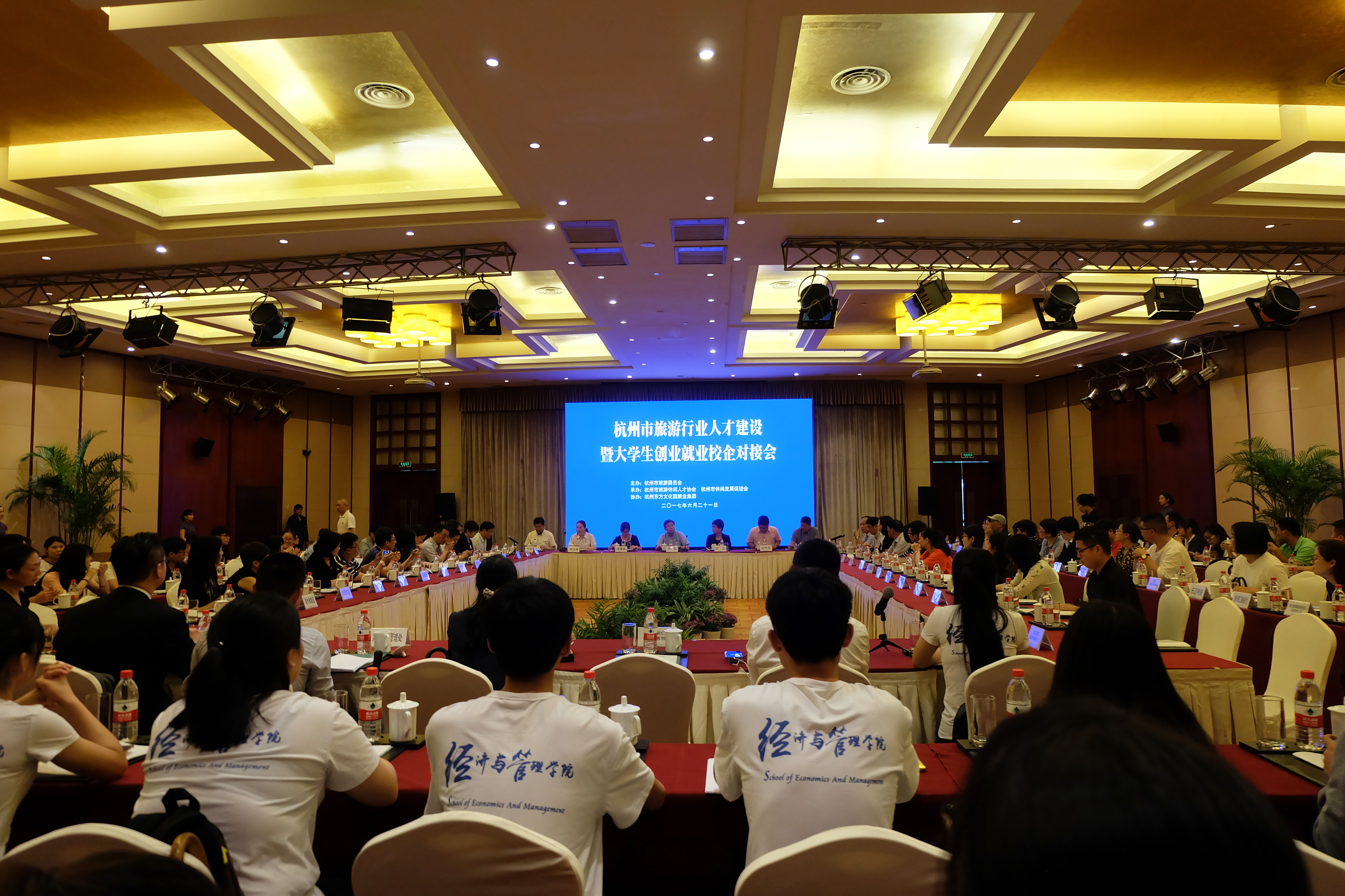 6月21日,经济与管理学院师生代表赴东方文化园参加杭州市旅游行业人才建设暨大学生创业就业校企对接会。本次对接会是由杭州市旅游委员会主办,杭州市旅游休闲人才协会和杭州市休闲发展促进会共同承办,杭州东方文化园旅业集团协办的行业盛会。