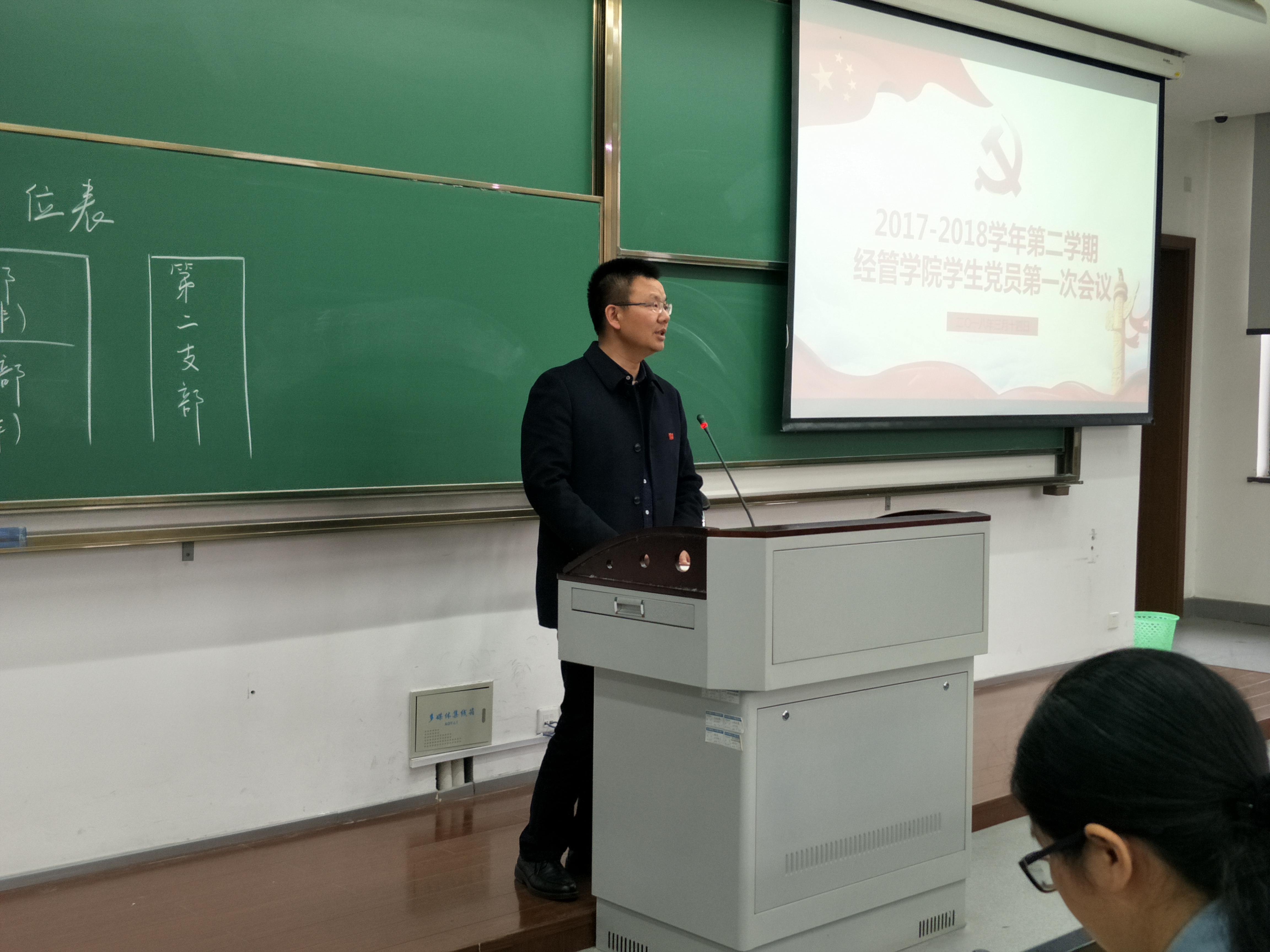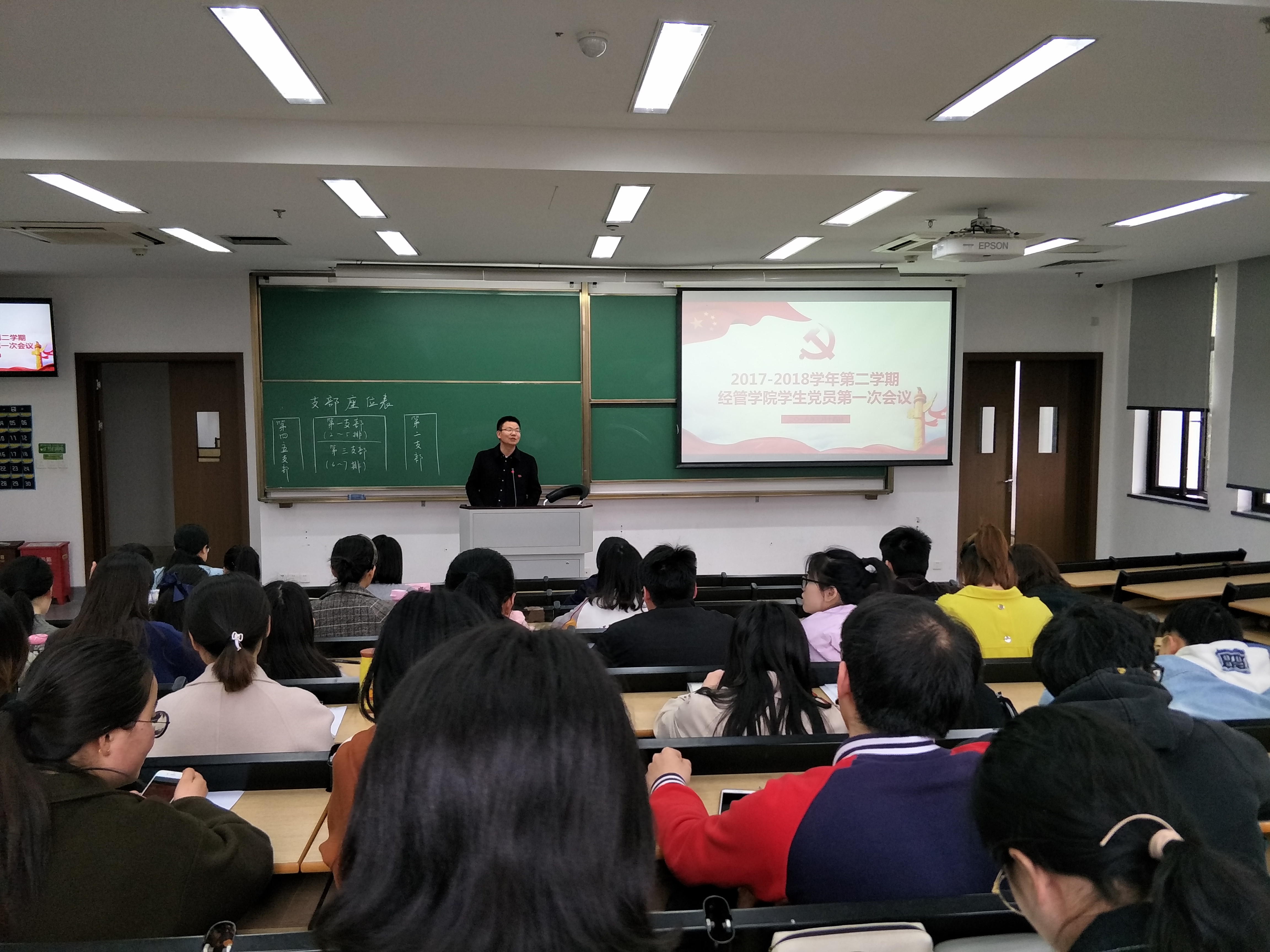 2018年3月14日下午,2017-2018学年第二学期经管学生党员第一次会议在恕园9号楼201教室顺利召开。出席本次会议的有钟江顺书记、辅导员丁花老师、兼职辅导员张航老师以及各党支部学生党员。