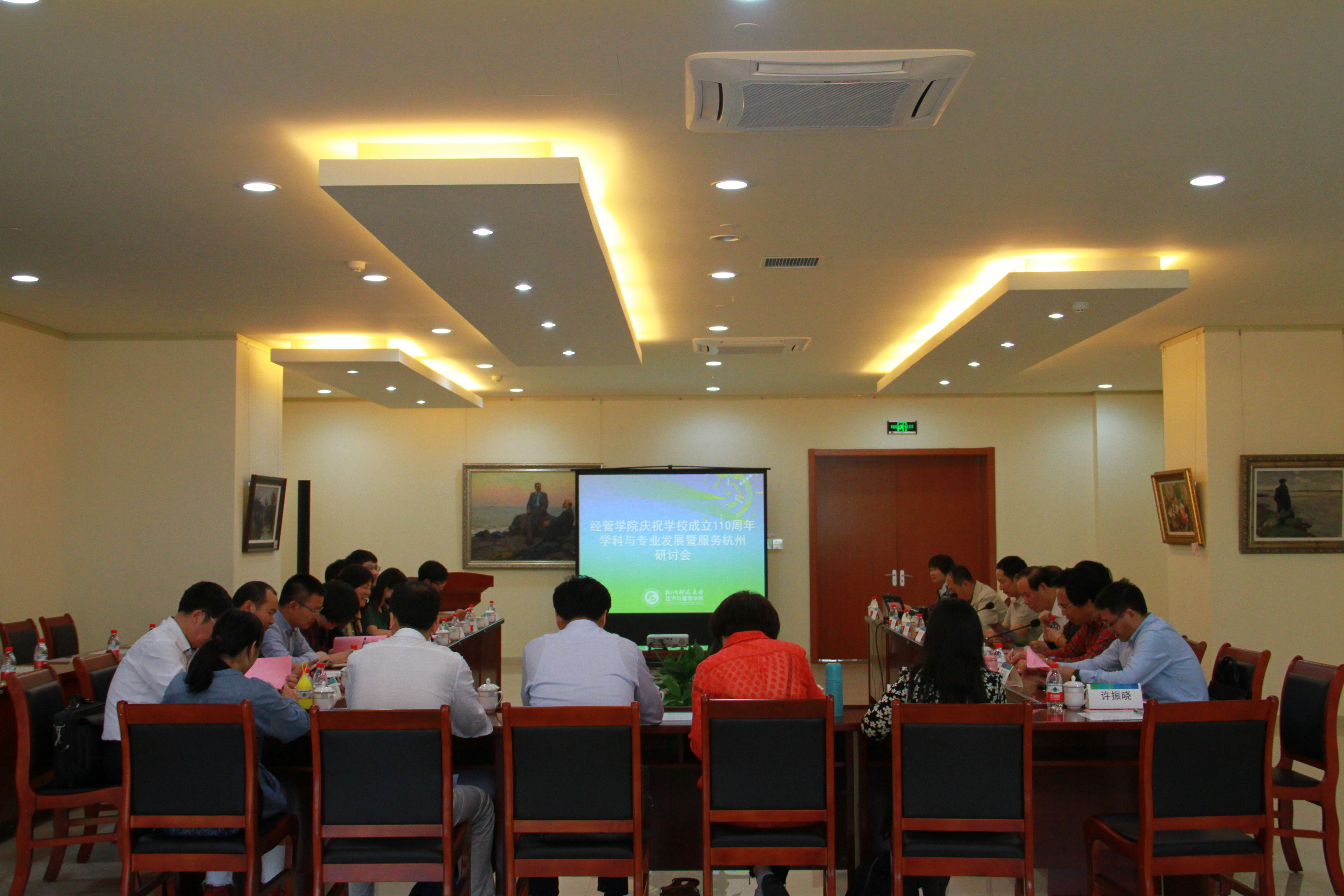 正值学校110周年校庆之际,近日,经管学院举办“庆祝学校成立110周年学科与专业发展暨服务杭州研讨会”。浙江财经大学原校长王俊豪、浙江省委党校副校长徐明华、浙江工业大学副校长虞晓芬、z浙江大学黄先海教授、宁波大学钟昌标教授以及浙江工商大学经济学院、旅游与城乡规划学院等高校十多位专家学者出席了研讨会,学校党委委员、副校长陈永富,党委委员、纪委书记郝敬习等校领导以及经管学院班子成员、中青年骨干教师、研究生等30多人参加了会议。