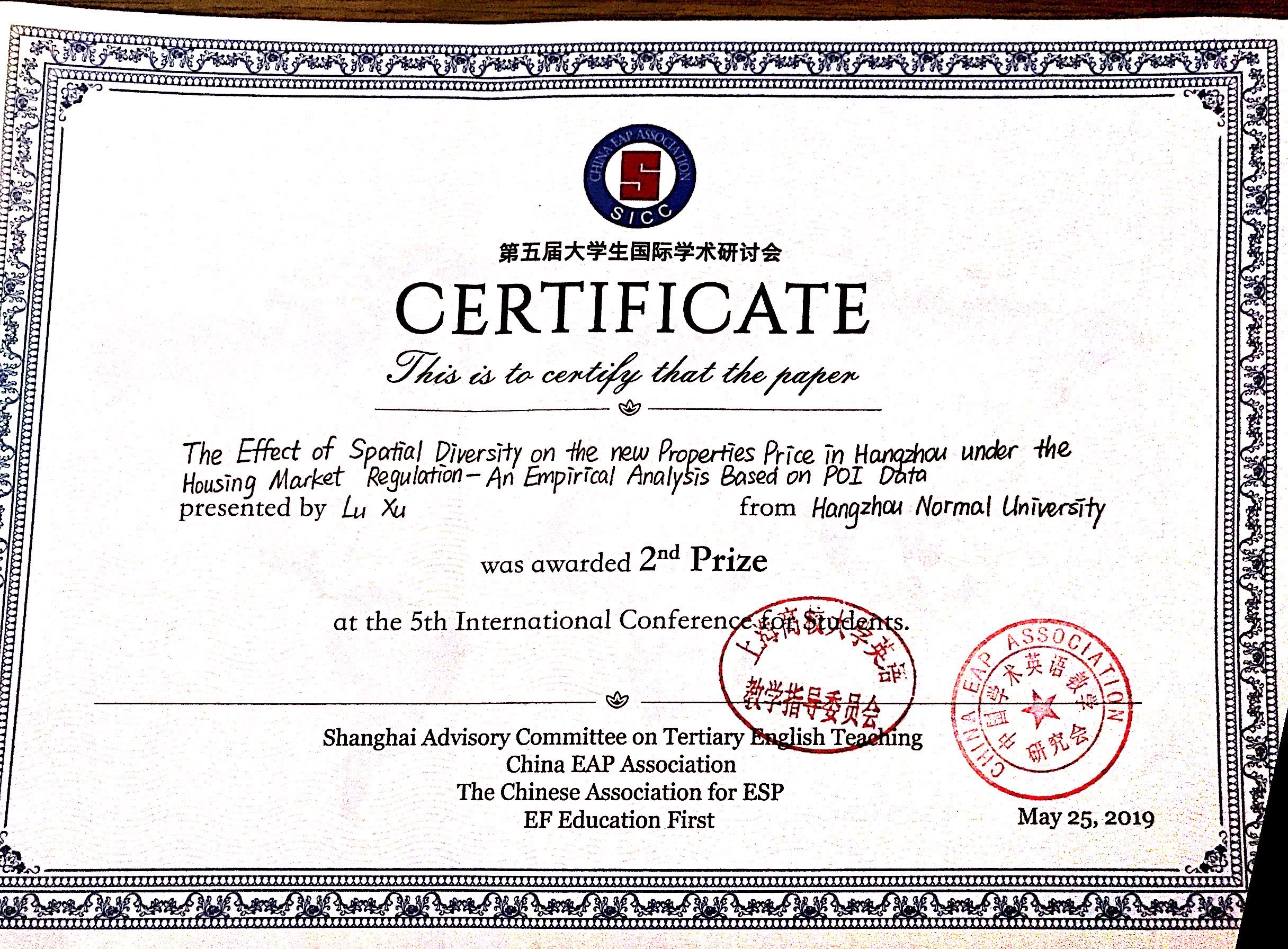 由上海市教育委员会指导,上海高校大学英语教学指导委员会、中国学术英语教学研究会、中国专门用途英语专业委员会、英孚教育和同济大学联合主办的“第五届大学生国际学术研讨会”近期在上海同济大学主会场召开,我院彭伟斌教授指导的2017级土地资源管理专业研究生徐露提交的论文《The Effect of Spatial Diversity on the new Properties in Hangzhou under the Housing Market Regulation-An Empirical Analysis Based on POI Data》从2700余篇论文中脱颖而出,荣获优秀论文二等奖,这是我院学生首次在该研讨会上斩获奖项。