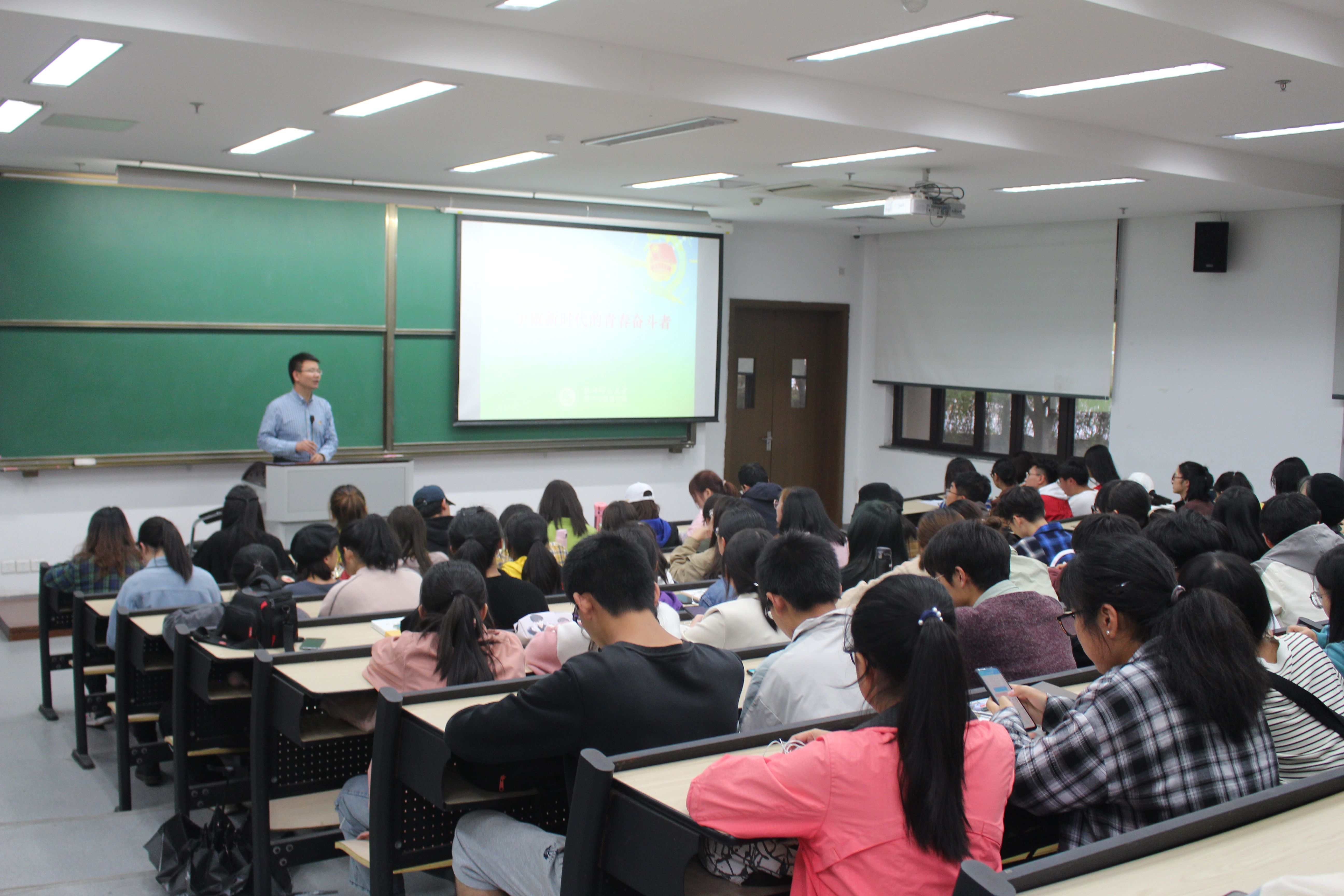 经管学院党委副书记钟江顺老师作了热情洋溢的致辞,他强调了开展团校培训和技能提升的重要性和必要性,希望团学干部提高团员意识和服务意识,发挥好桥梁和纽带作用。随后,钟书记作了“争做新时代的青春奋斗者”主题团课。团课围绕我是谁、为了谁、怎么做三个问题进行阐述,以团史为脉络,向大家展现了共青团员的历史形象和历史任务,并强调了中国共产主义青年团现阶段的基本任务。随后,他以党的十九大中的青年篇为核心,向大家讲述了怎样在新时代去做一个德学兼备的青年。青年一代有理想、有本领、有担当,国家就有前途,民族就有希望。会议最后,钟书记向大家重点讲述学院学生工作理念和院训,鼓励学生要学会明德、求知、励学、善思,坚定个人的思想,争做新时代的青春奋斗者。