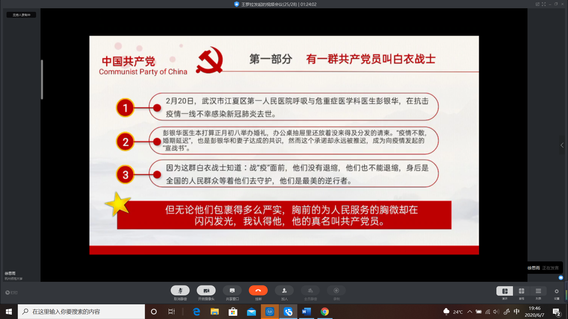 6月7日,经济与管理学院第四届“微党课”大赛决赛如期在线上举行。从学院五个学生党支部初赛中脱颖而出的19名参赛选手轮流进行线上演讲,学院学生党支部书记戴丽华老师、魏菁菁老师,研究生党支部书记张增辉,“微党课”一等奖获得者张航与党务中心干部共同出席本次比赛并担任评委,各支部入党积极分子、发展对象和党员悉数到场聆听学习。