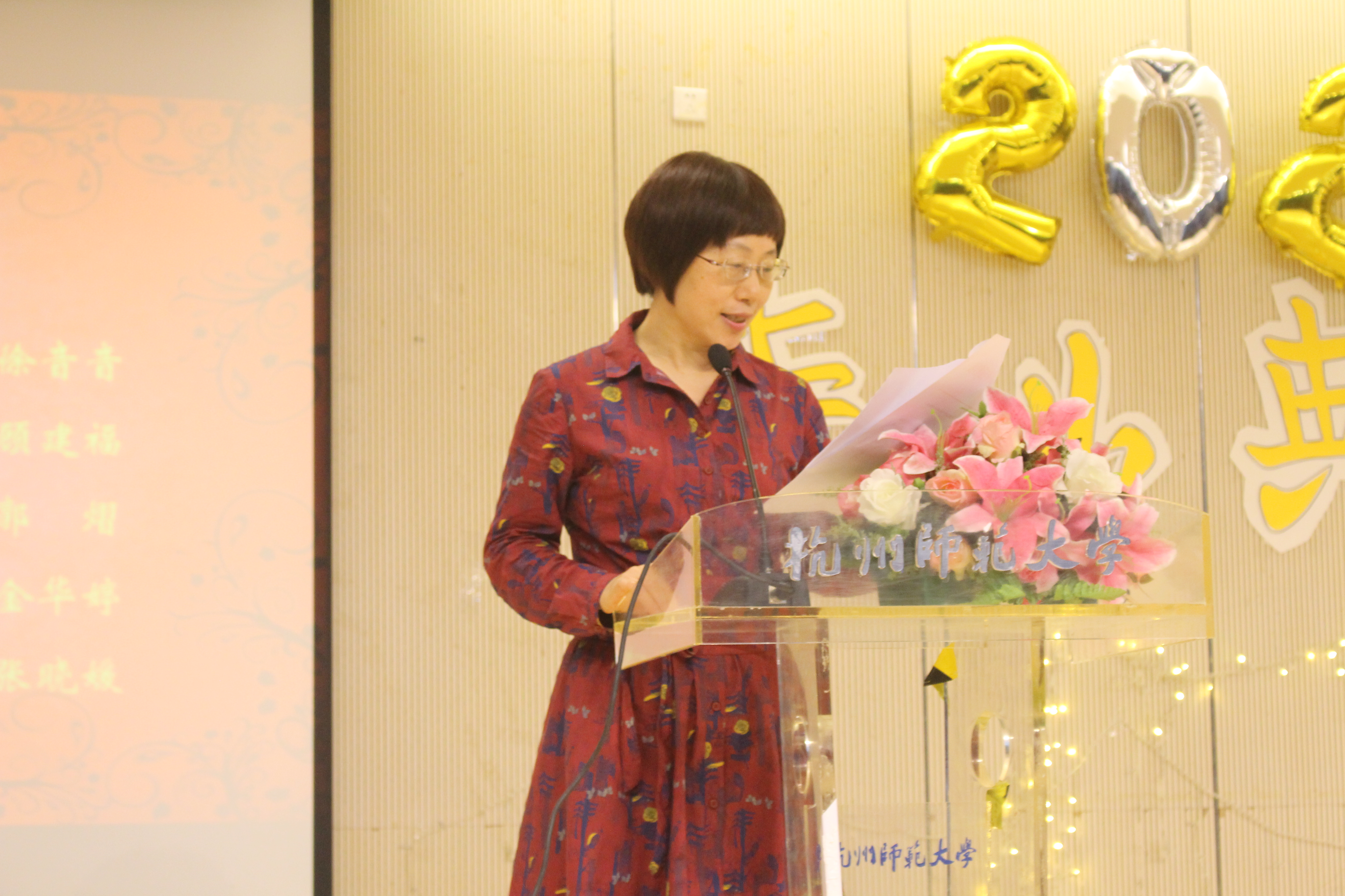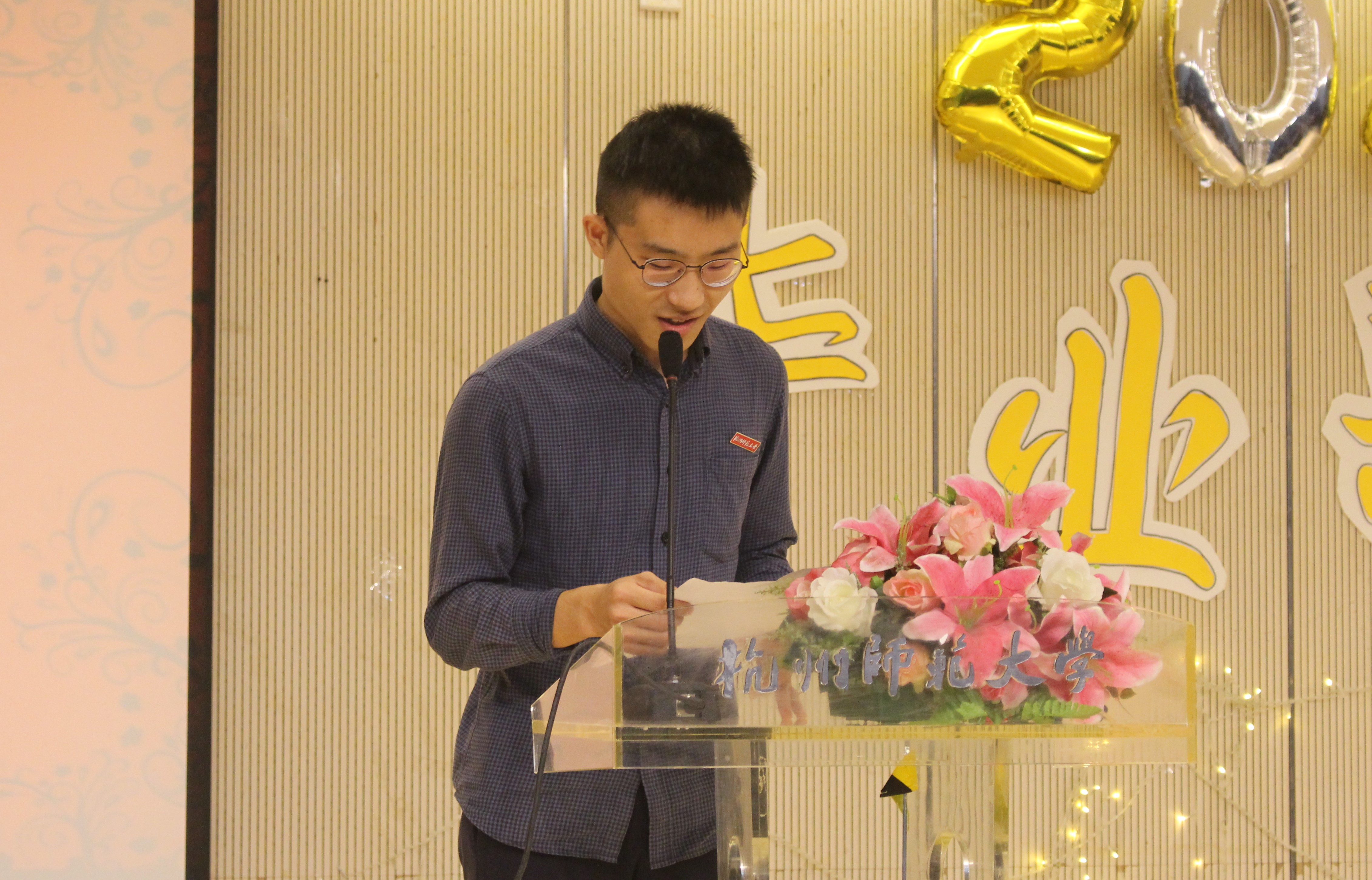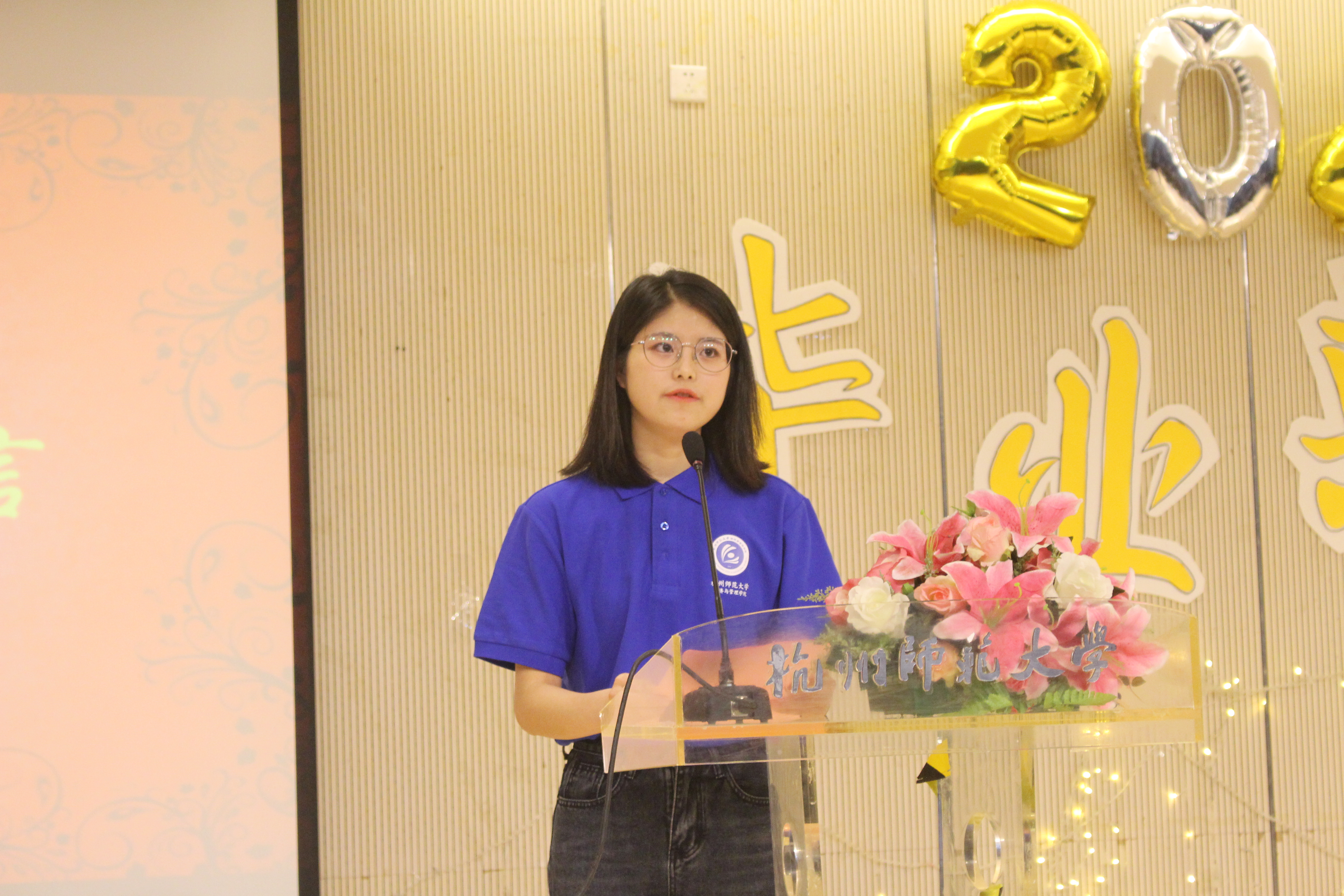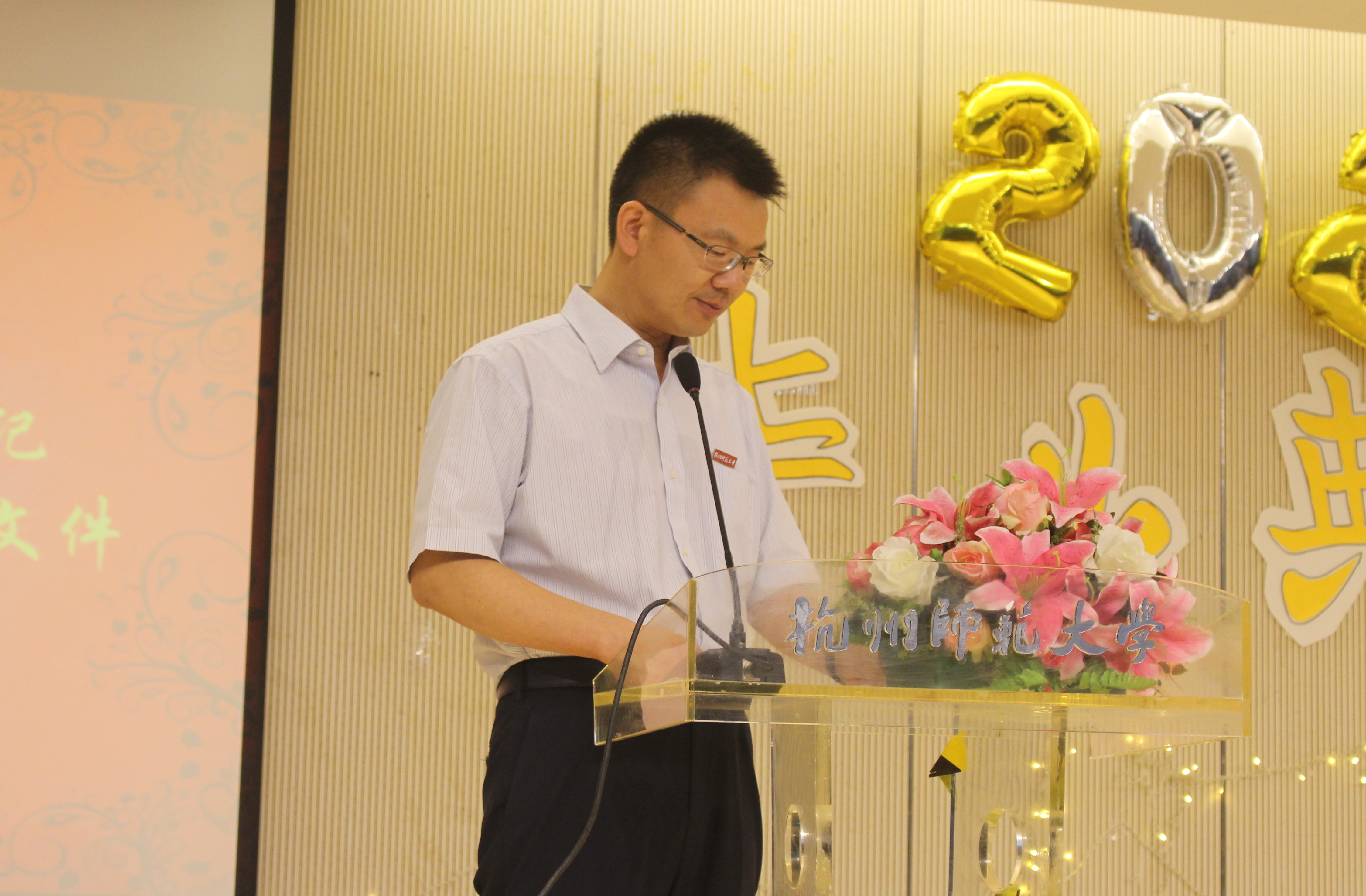 温暖感人的纪念视频播放完后,全体师生合唱杭州师范大学校歌。随后,郭书记上台致辞,将最美好的祝福送给即将踏出校门的学子,话语间透露对同学们的殷切期盼。之后,副院长杨富荣、方湖柳老师依次上台,分别宣读了省优、校优毕业生的表彰决定。紧接着,党委副书记钟江顺宣读了2020届毕业生校友联络名单,并对他们表示祝贺。