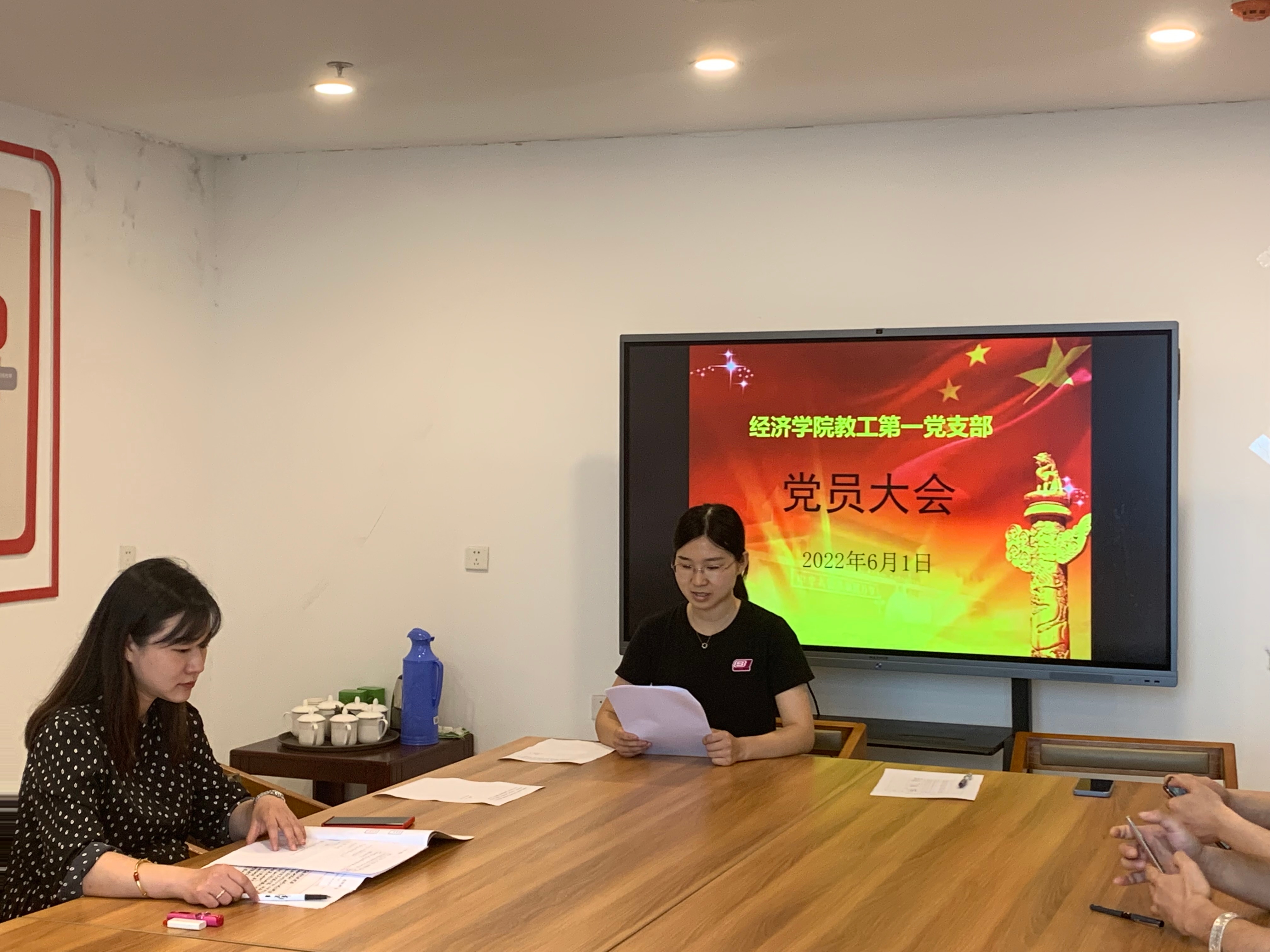为进一步加强基层党组织建设,落实党支部发展党员工作计划,6月1日,经济学院教工第一党支部召开了接收预备党员大会,讨论党员发展对象赵玉京的入党问题,会议由支部书记骆莙函主持。
