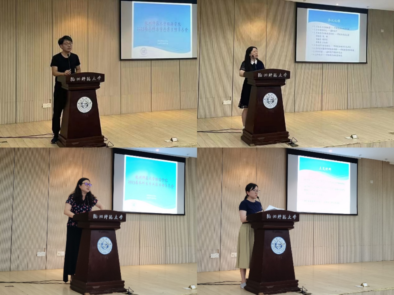 6月16日下午,杭州师范大学经济学院2023届本科生专业实习动员大会在恕园2-113报告厅成功举办。学院党委书记余龙进教授、党委副书记毛卓尔出席大会并讲话,院长助理曾绍龙主持大会,特邀企业代表浙江盈阳资产相关管理人员、各系系主任、2019级全体学生参会。