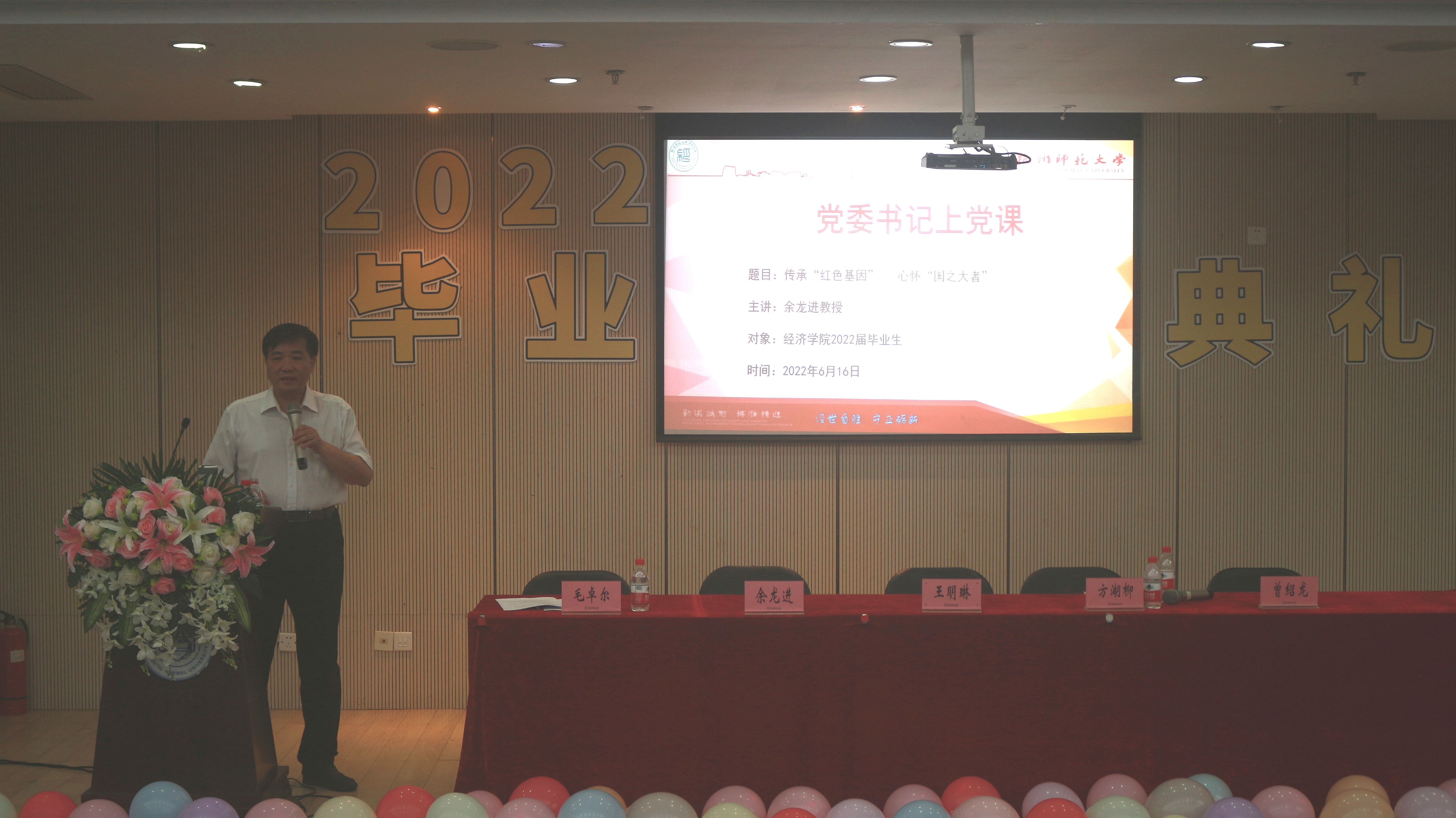 2022届毕业生即将扬帆起航,2022年6月16日周四下午三点,杭州师范大学经济学院党委书记余龙进老师和党委副书记毛卓尔老师在恕园2-113为全体毕业生上了最后一堂党课。