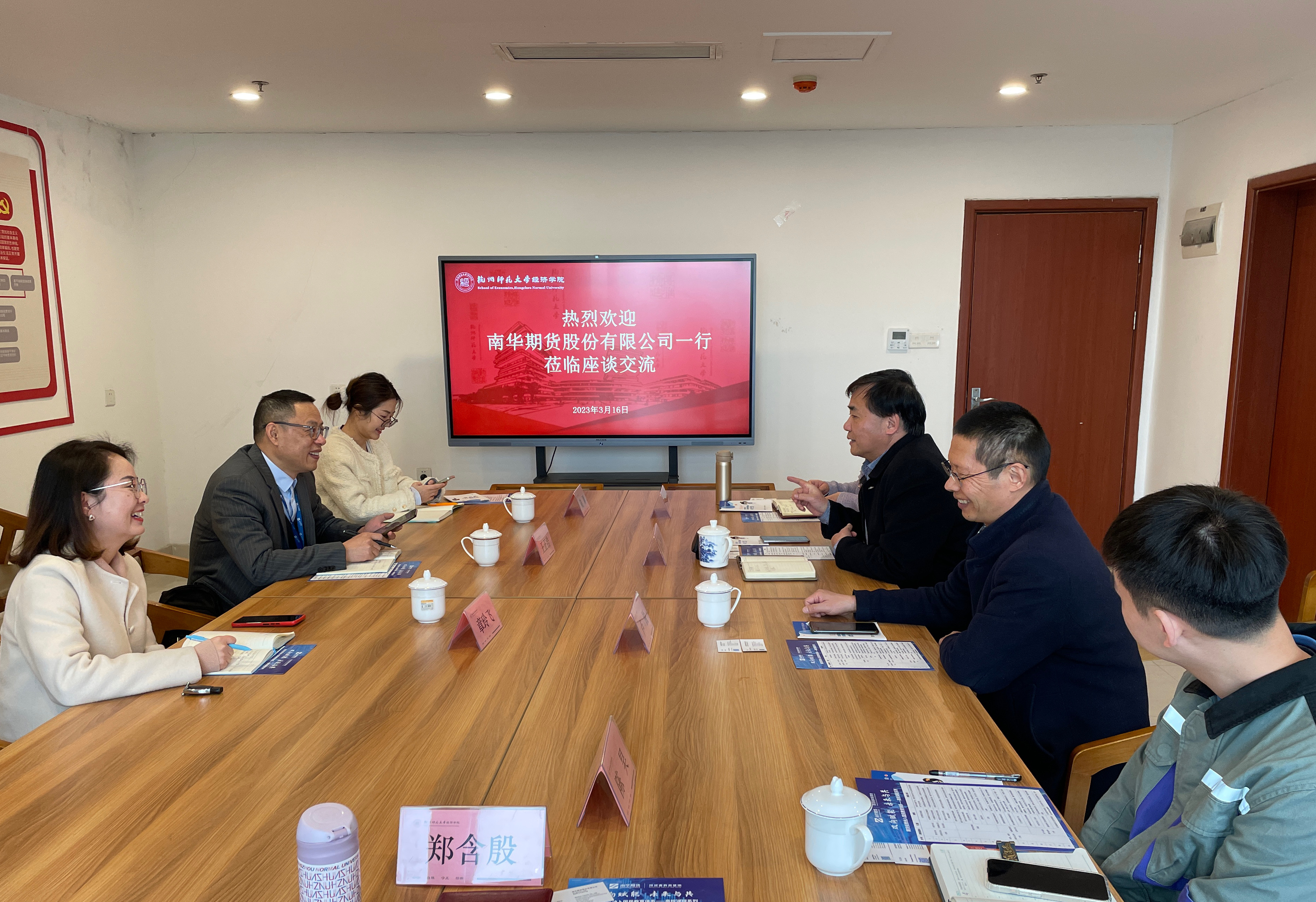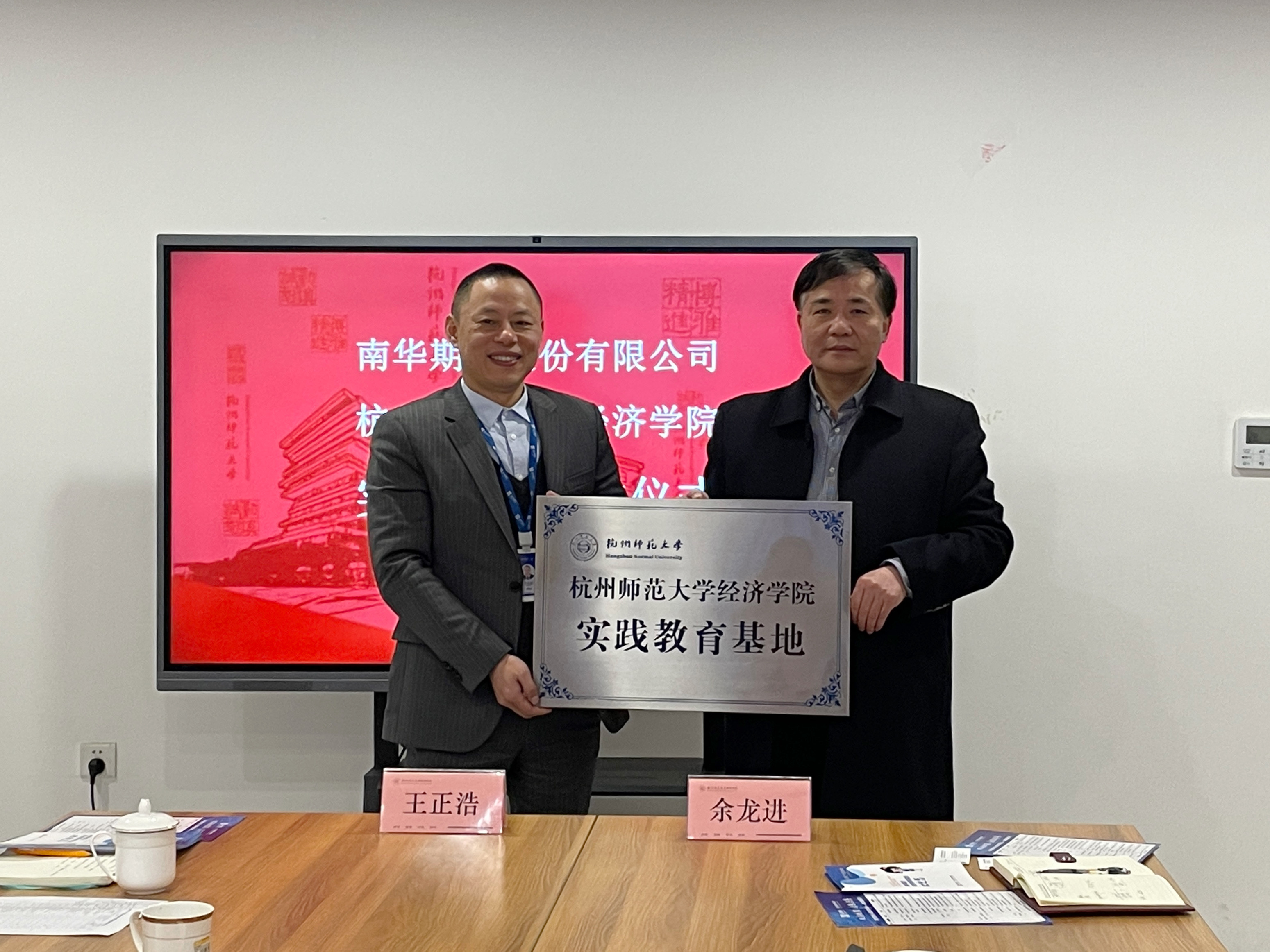 3月16日下午,学院实践教育基地共建单位——南华期货由副总经理王正浩、南华投资学院执行院长章玲飞等作为企业代表来访,参加校企合作授牌仪式。学院党委书记余龙进教授、金融系系主任卢锐教授、副系主任项洁雯老师、金融系教师陈昊,以及学院教务科老师参加了授牌仪式。