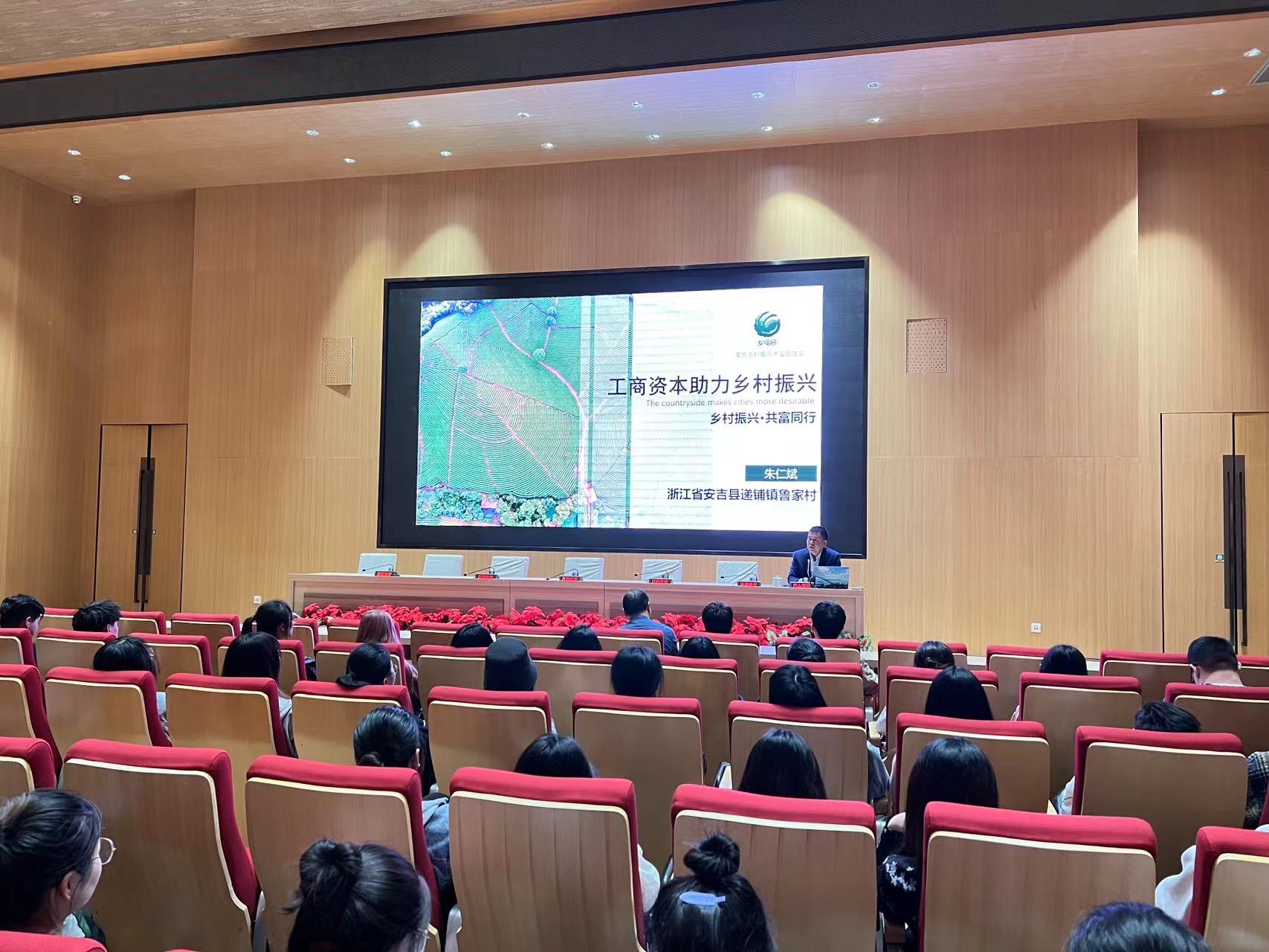 鲁家村党委书记朱仁斌为师生们作题为《乡村振兴、共富同行》的报告,详细介绍鲁家村借助工商资本走向共同富裕的先进经验,并鼓励同学们返乡创业,为乡村振兴和共同富裕贡献力量。位于浙江湖州安吉县东北部的鲁家村,地形以山地丘陵为主,过去村集体收入不足2万元,如今以18个各具特色的农场为载体,以“公司+村+家庭农场”模式,蝶变为“开门就是花园、全村都是景区”的中国美丽乡村精品示范村。
