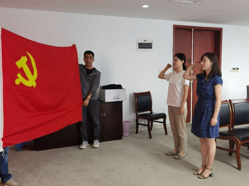 表决通过后, 赵玉京同志与领誓人紧握右拳,面向庄严的党旗宣誓。
