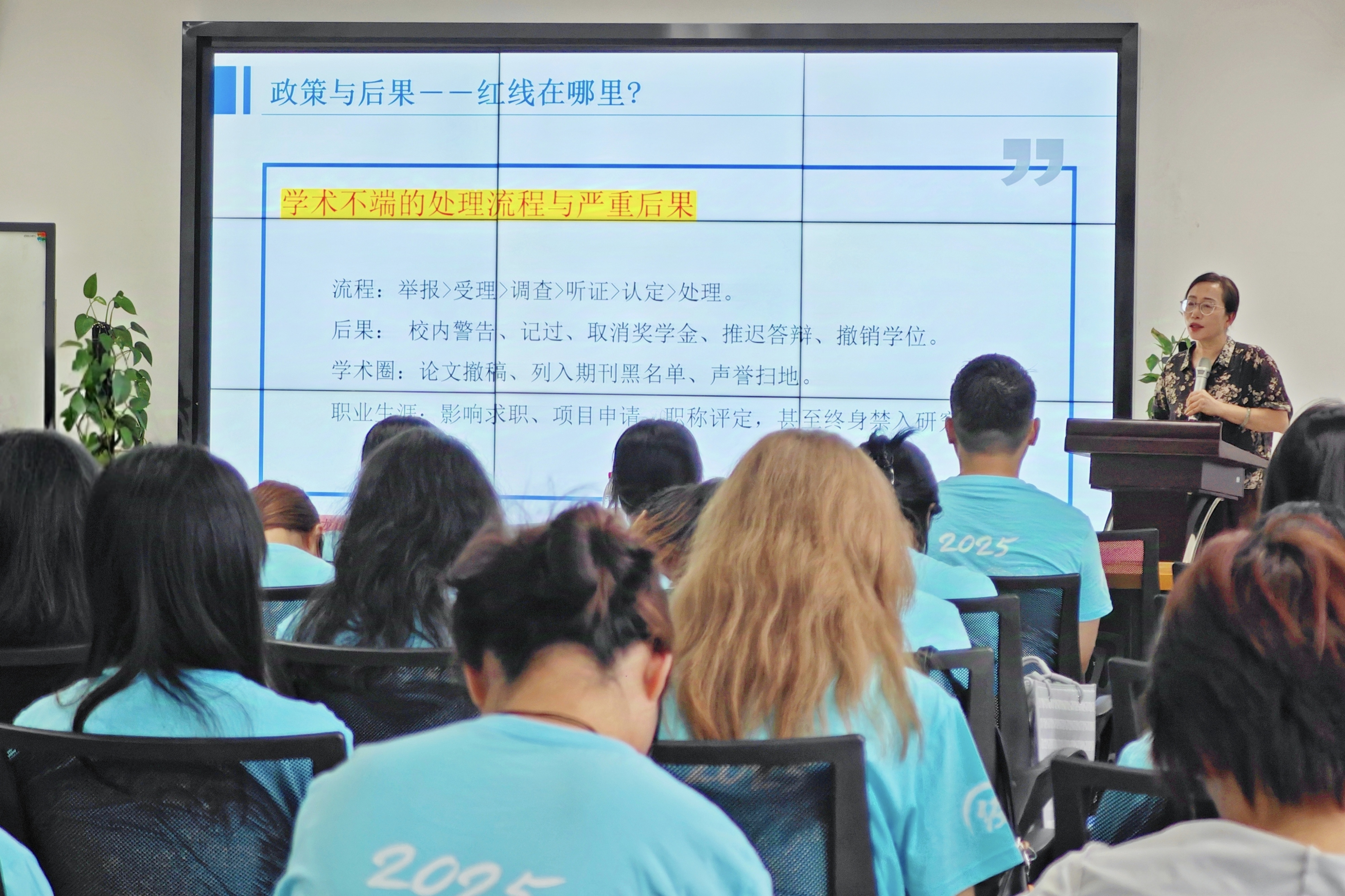 新生入学仪式后,副院长方湖柳讲了《开学第一课》:《坚守学术底线,点亮科研之路——研究生科研诚信与学术规范专题讲座》,围绕科研诚信为何如此重要、认识科研不端行为、政策与后果、如何避免不端行为等方面内容,通过生动的案例和深入的讲解,让研究生深刻认识到坚守科研诚信与学术规范的必要性和重要性。